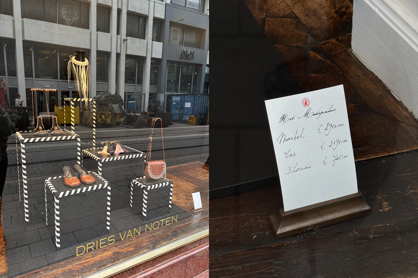 While walking past shops in Antwerp, I began to understand just how significant windows are. In the morning, before doors opened for the day, I noticed people in shop windows readjusting displays or setting a new scene. Passersby stoped to take in the windows, a pair of shoes, a skirt, its price. As we stood in front of one of the elaborate windows of Dries Van Noten, an elderly couple crossed the street to discuss a men’s suit that had caught the woman’s eye. Window shopping becomes a way in which to learn, discover, and fantasize.