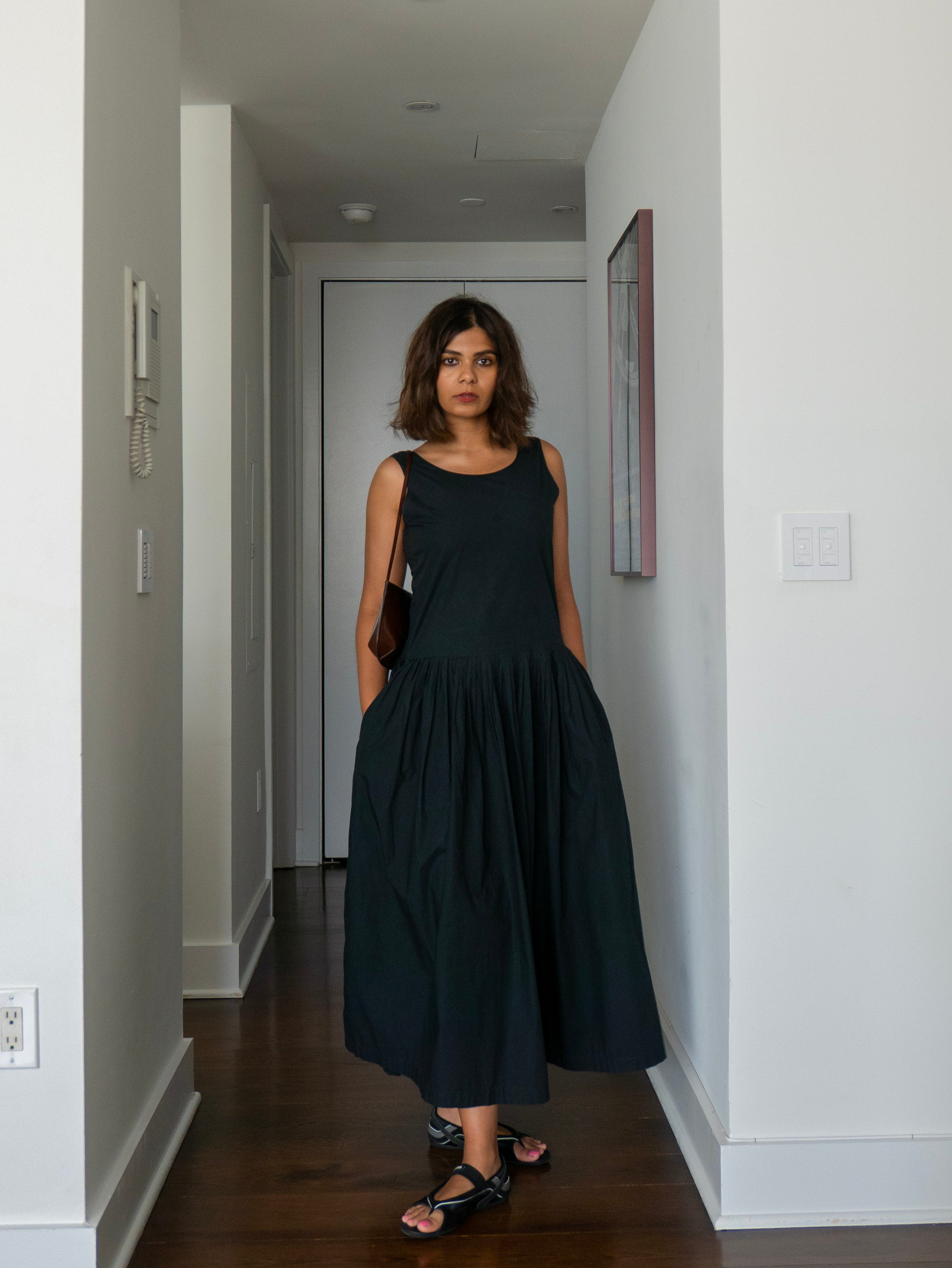 A few morsels of wisdom I have earned in my 35 years is that I have more or less come to terms with what clothes work for me, what clothes do not, and that it is always more satisfying to wear what pleases me. To get myself out of the house without feeling like too-much of an emotional mess, I instinctively reached for my trusty black dress by the Perugian designer Sara Lanzi. Made from cotton, it has a voluminous pleated skirt, deep pockets, and accommodating adjustable ties just where the shoulder blades end and low on the waist. Since the designer gifted it to me when I met her at her studio sale a few years ago, I have worn it countless times over the summers. In it, I feel protected and pretty (I need to add that Lanzi’s designs have Rei Kawakubo’s seal of approval).